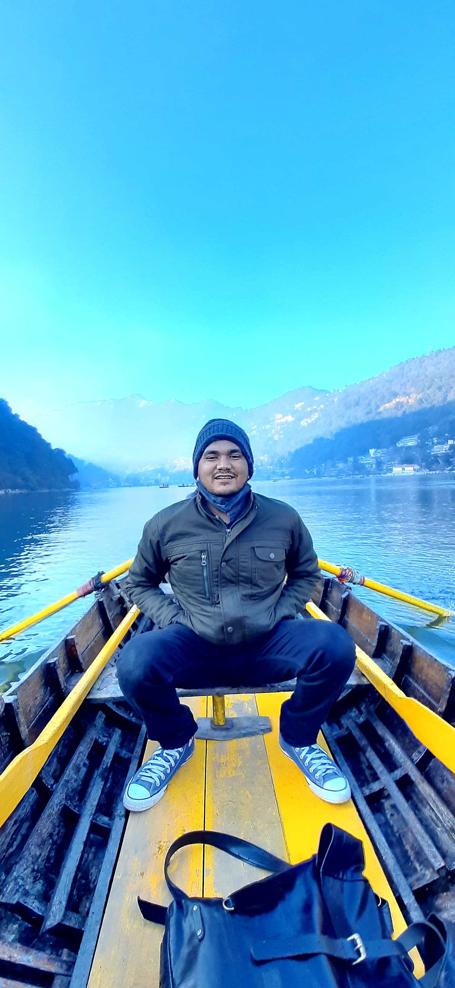 Enjoying a peaceful boat ride on Naini Lake in Nainital, surrounded by lush greenery and breathtaking views.