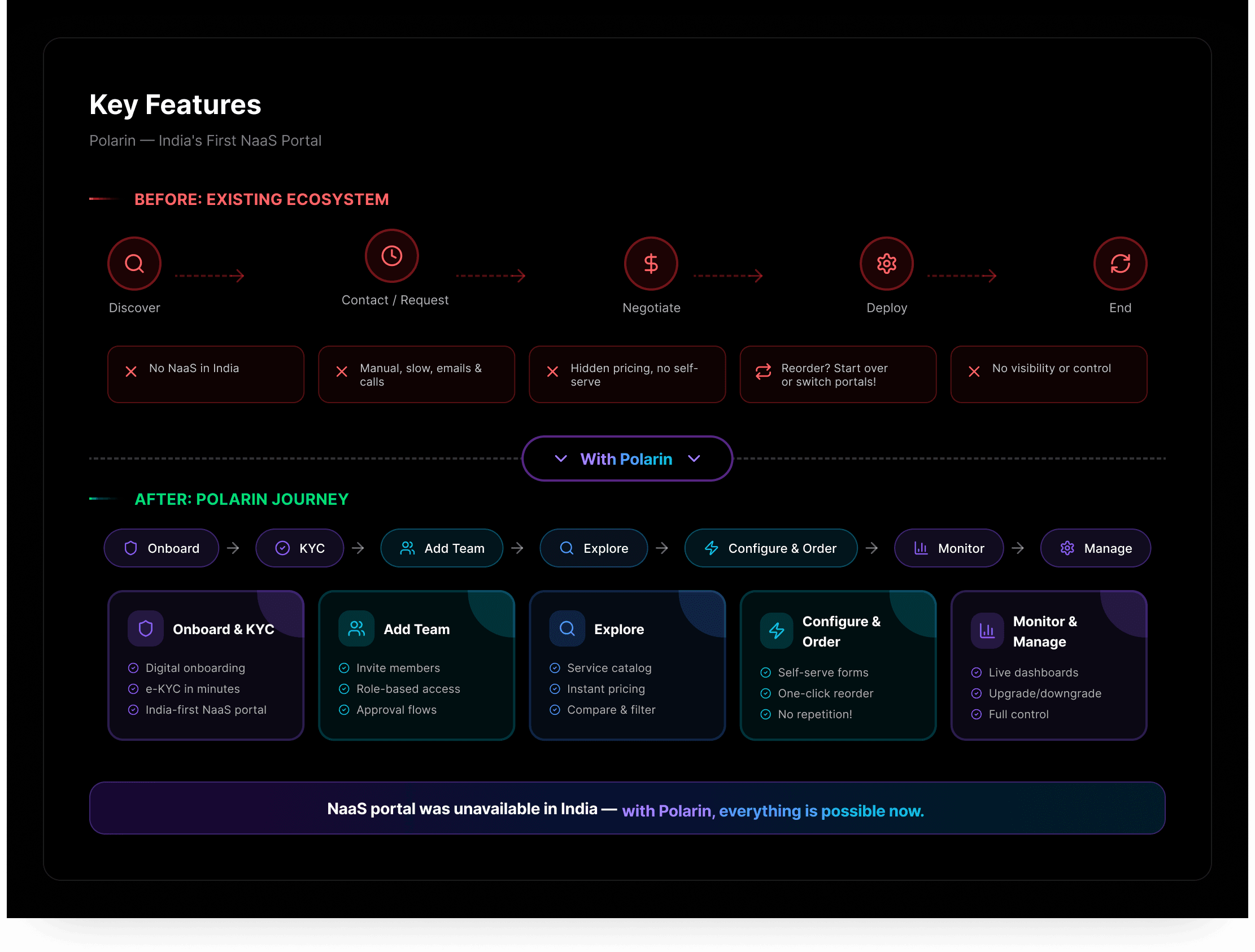 The global NaaS market was at $19.2B growing at 35% CAGR. India — with active 5G rollout across 300+ cities and enterprises rapidly moving to multi-cloud — had zero native self-serve NaaS players. The gap was obvious. The product didn't exist yet.