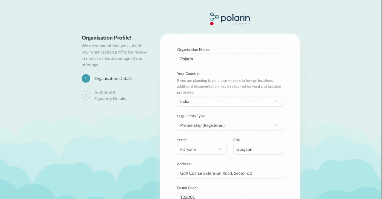 Once an organization submits their profile, an admin portal is created for internal users to review and approve the KYC information. This streamlined process ensures timely verification and service activation.